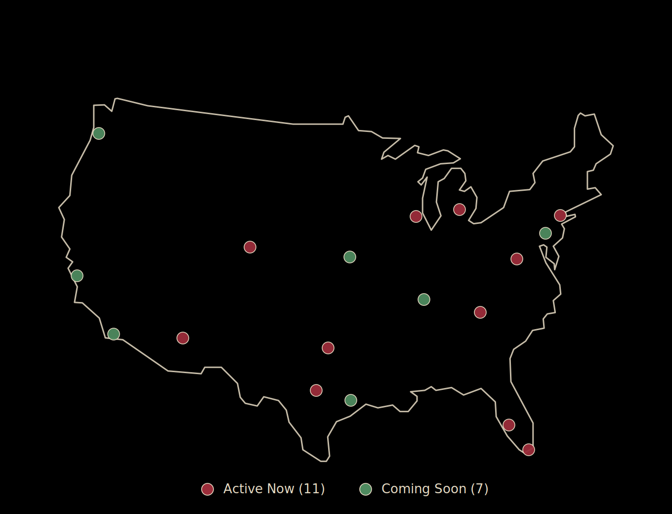 Base is active in Austin, Boston, Charlotte, Chicago, Dallas, Denver, Detroit, Miami, Phoenix, Tampa, and Washington DC.